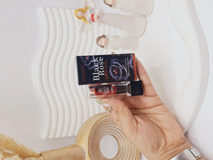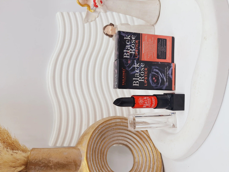 نمای ظاهری رژ مشکی است که حاوی عصاره رز سیاه است اما پس استفاده رنگ سرخابی زیبایی نمایان