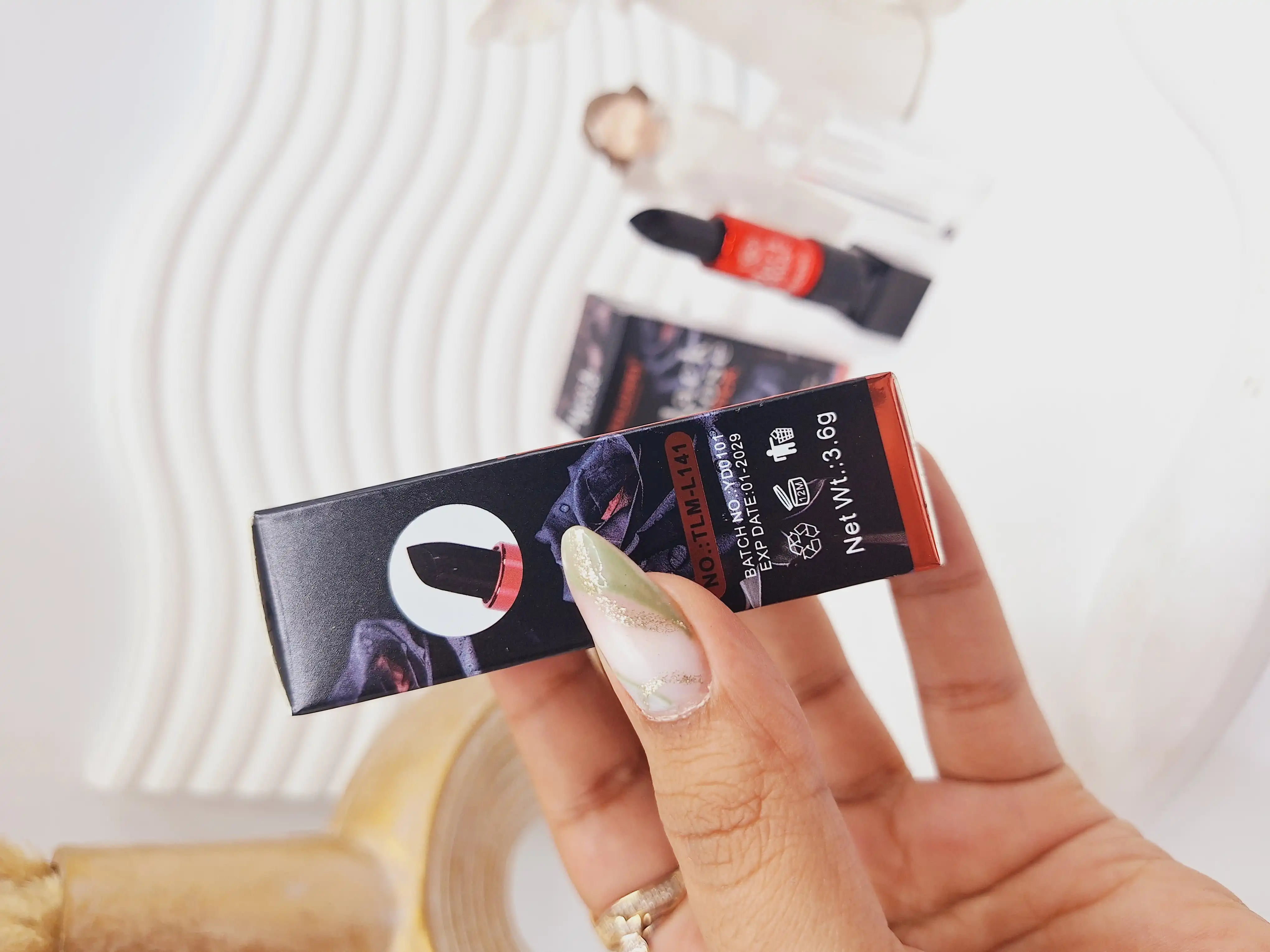 نمای ظاهری رژ مشکی است که حاوی عصاره رز سیاه است اما پس استفاده رنگ سرخابی زیبایی نمایان