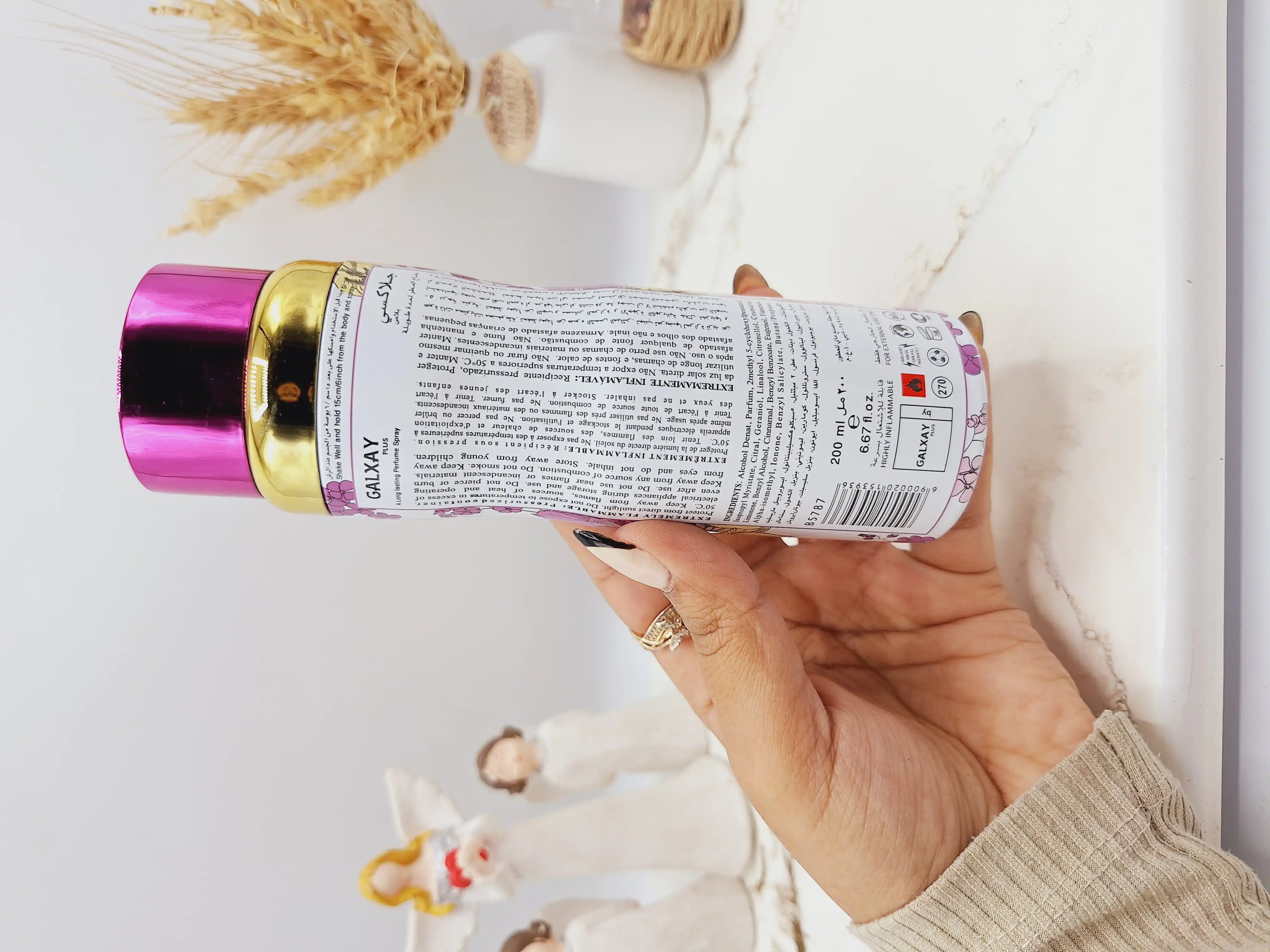 اسپری های خوشبوکننده گلکسی مناسب برای استفاده بر روی پوست و لباس شما می باشد اما در هر صورت بهتر است که از اسپری های خوشبو کننده بر روی پوست بدن استفاده نکنید مگر از نوع ضد عرق آن باشد. اسپری های خوشبوکننده گلکسی دارای ماندگاری بسیار بالا است زیرا از مواد بسیار عالی و با کیفیت تهیه شده و به دلیل سری مناسب آن پخش بوی بسیار متناسبی را دارد حجم : 200 میل با ماندگاری بالا با رایحه های خوشبو تولید : اماراتنظرات